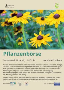 Am Samstag, den 18. April sind wir von 12 bis 17 Uhr mit einem Infostand und Jungpflanzen in Bad Doberan bei der Pflanzenbörse vor dem Kornhaus dabei.
